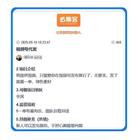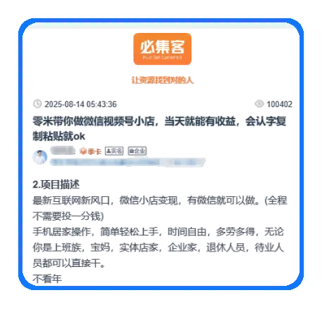 当然,如果你觉得准备账号、日常维护、视频剪辑这些太麻烦,也可以到必集客上找视频号合作项目。
