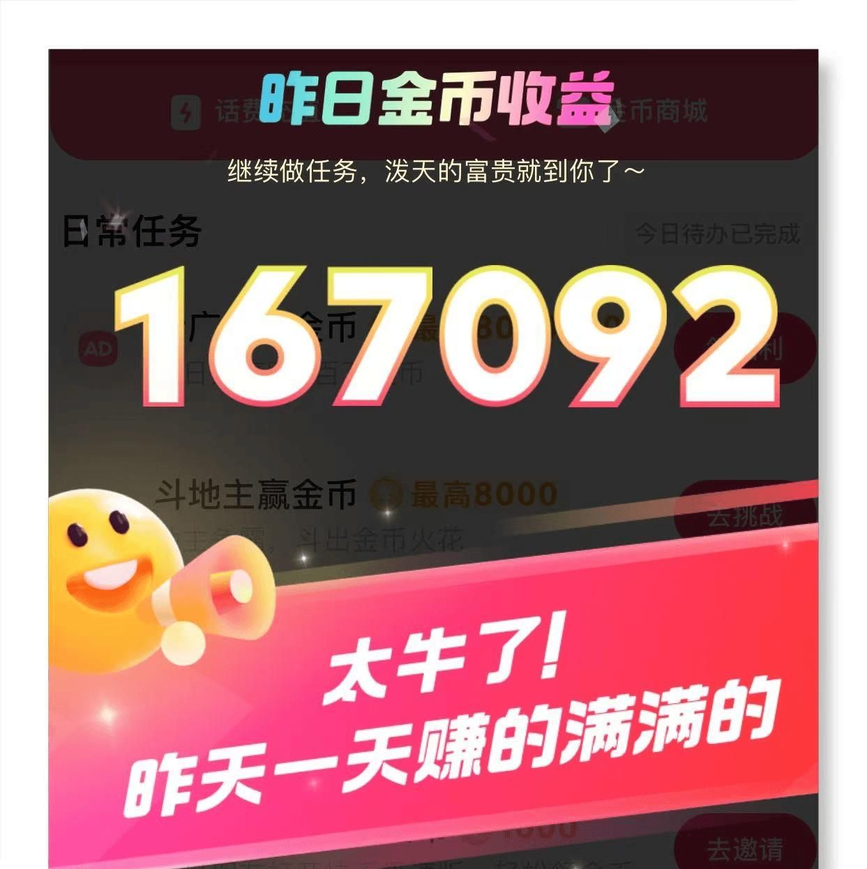 快手极速版的领金币任务相对来说类型较多,除了签到和看广告,还有玩游戏等任务;其金币兑换比例也是10000:1,方法得当的话,每天可获得10-20万金币,即10-20元。