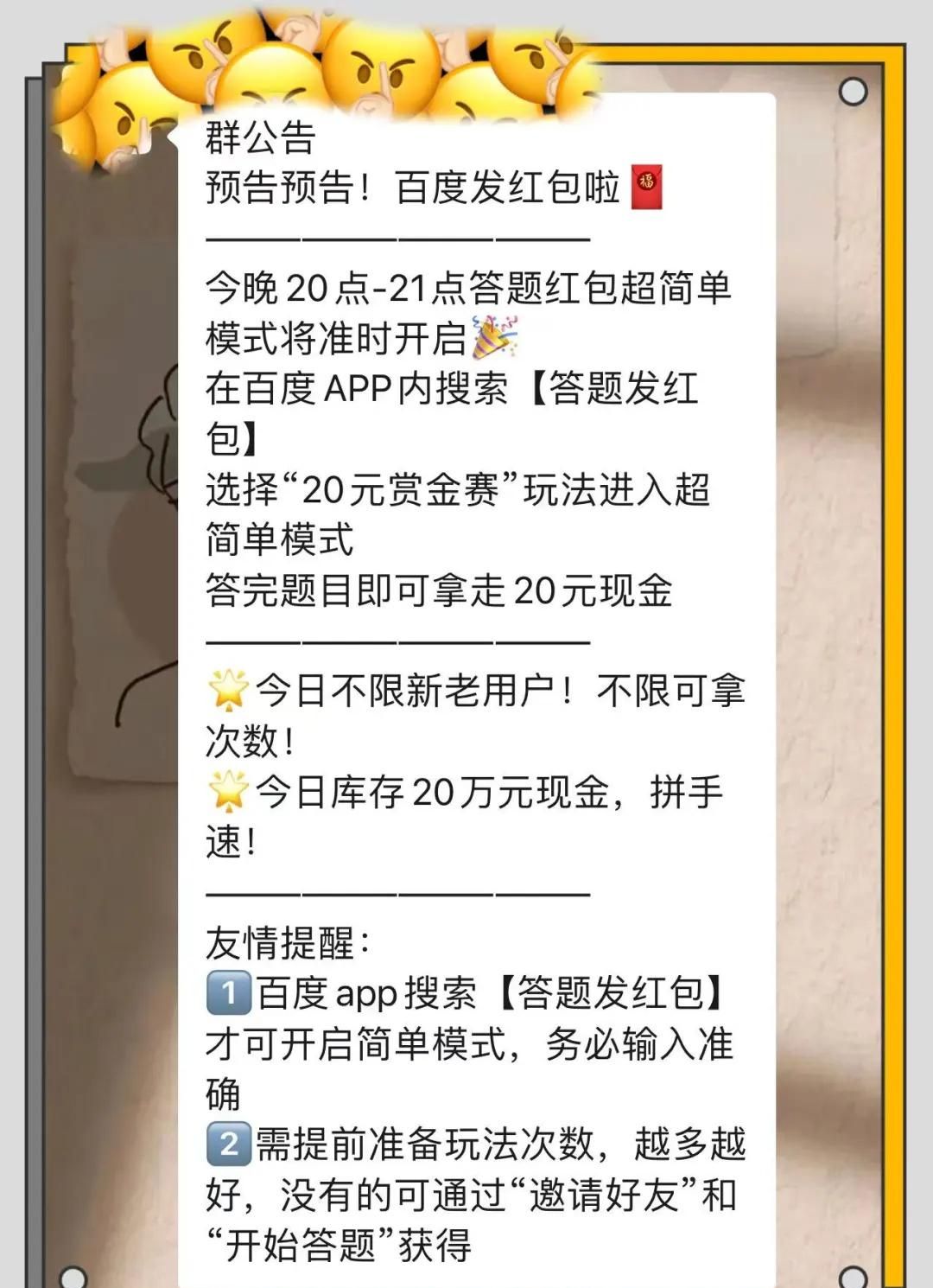 - 在百度APP内搜索“答题发红包”,选择“20元赏金赛”玩法,进入超简单模式;