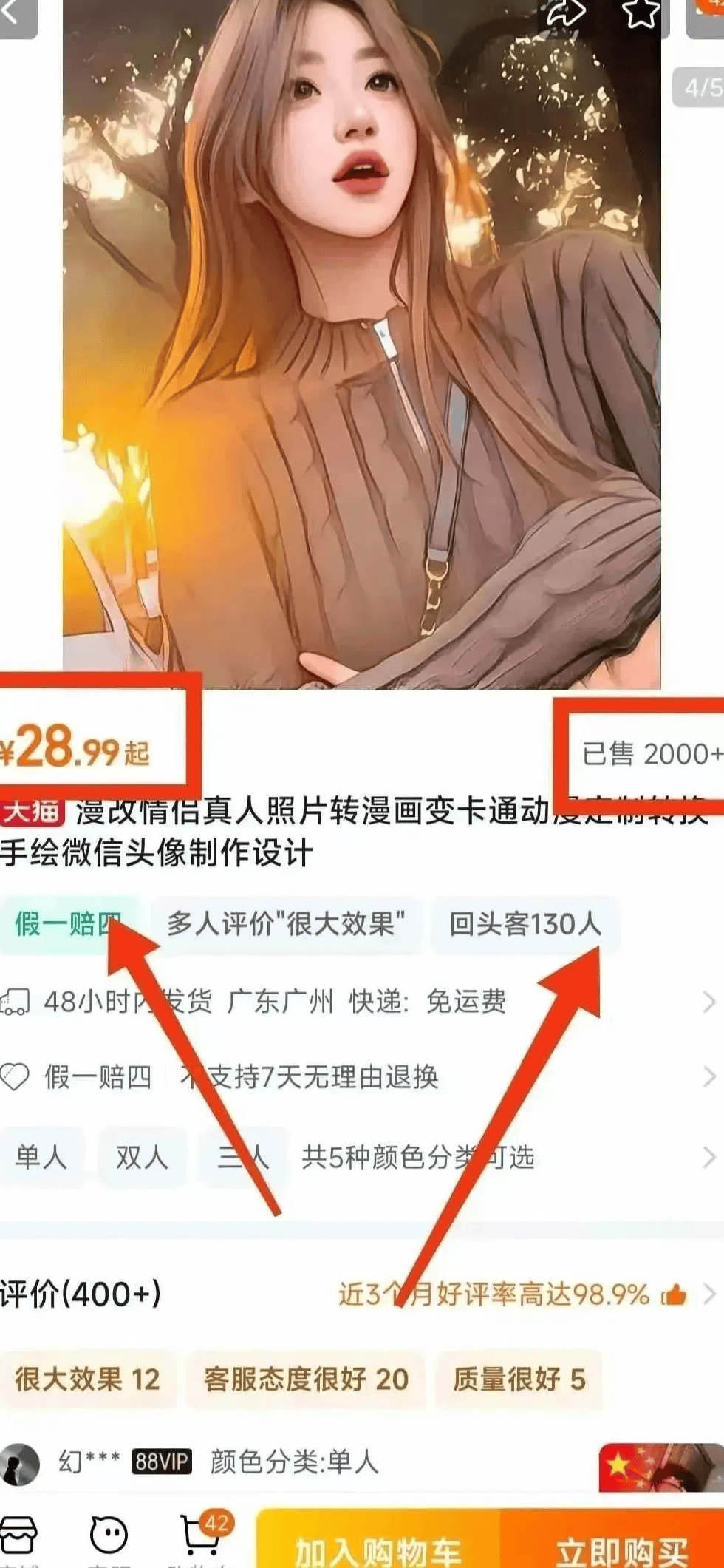 在某宝上也有人靠这个赚钱:一单28.99元,卖了2000多单,赚了四万多块!这收益太惊人了,小红书漫改头像的市场,简直大得惊人!