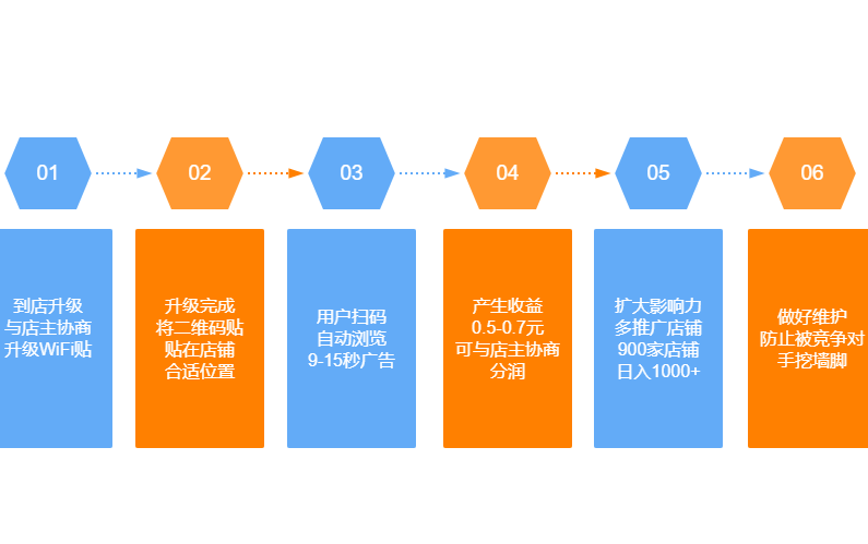 所谓共享WiFi贴推广,就是前往有客流的场所——包括但不限于餐饮店、奶茶店、酒店、高铁站等地,免费帮商家升级WiFi连接方式:从原本的输入密码登录,升级为扫码观看广告后登录,用户每次登录都需要观看9-15秒的广告,而这短短几秒的广告,就能为你带来约0.7元的收入。