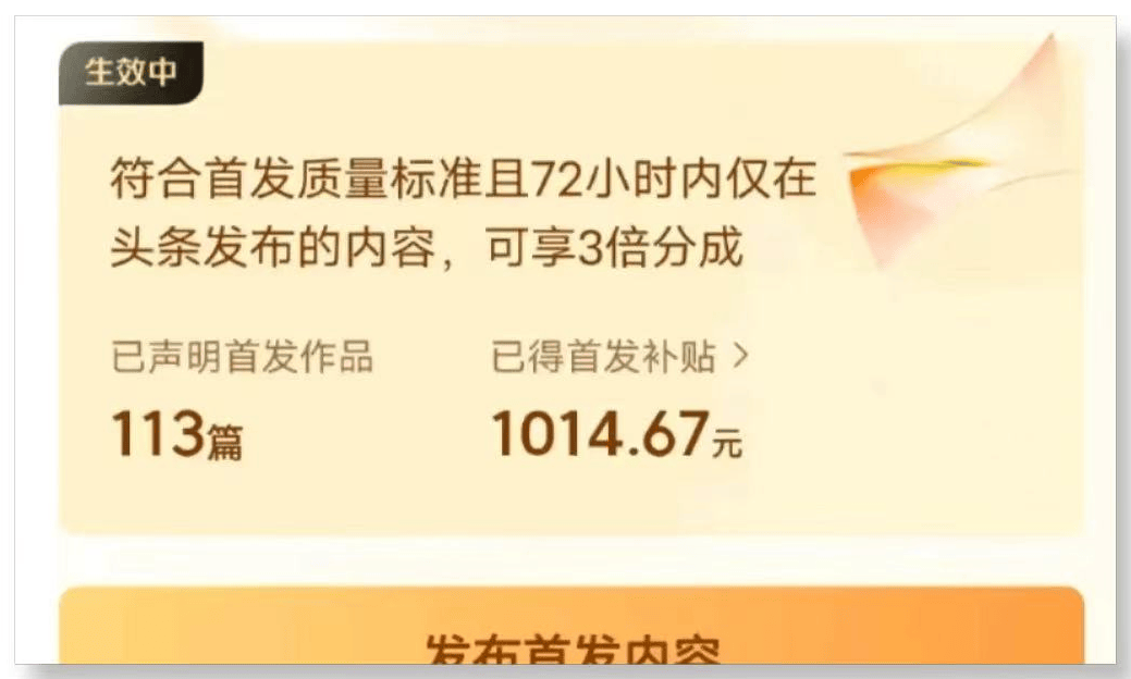 今日头条的收益虽与阅读量挂钩,却不止于此——平台还设有“首发机制”。