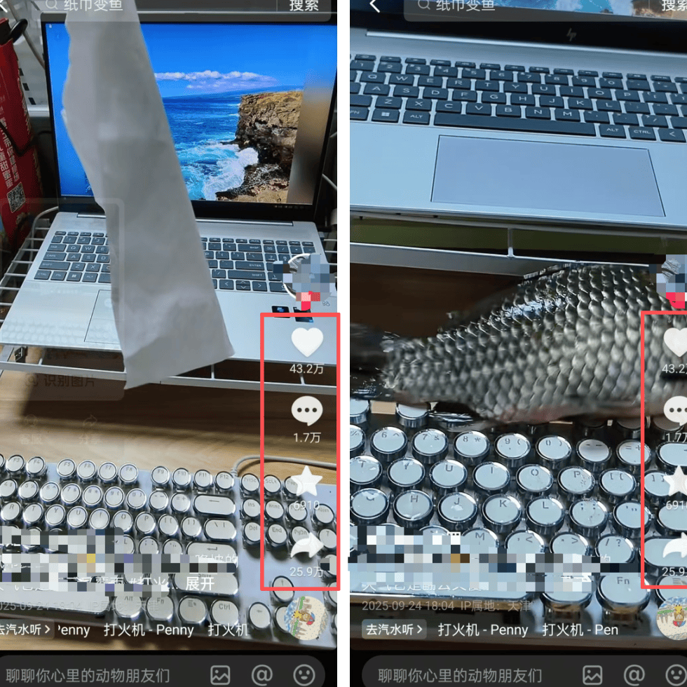 看完这个视频我第一反应就是:这到底是怎么做到的?内容其实很简单,就是把纸巾扔到键盘上,下一秒纸巾就变成了一条活蹦乱跳的鱼。我立马反应过来这肯定是AI做的效果,现实里当然不可能发生这种事,也更勾起了我的探索欲,非要搞清楚背后的原理。