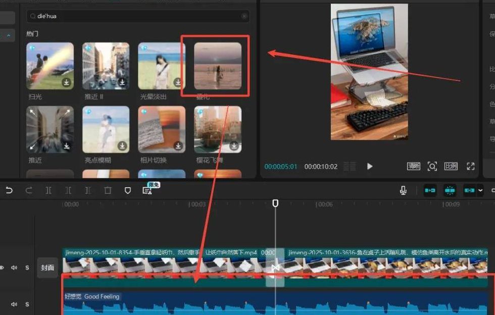 最后一步就是成品合成了。我把两段生成好的视频下载下来,导入剪映里拼接,试着在两段视频中间加了“叠化”转场之后,我瞬间就懂了,那个丝滑神奇的变身效果就是这么来的,最后配上契合的BGM,整个作品的感觉就完全出来了。