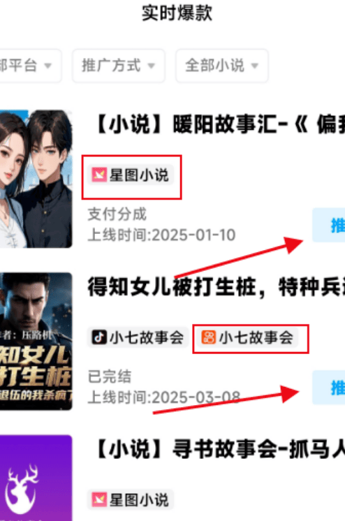 第三步是选小说:进入推广平台之后找到小说类目,既可以跟风做当下的实时爆款,也可以去选文中心自己选,操作很灵活。需要注意看小说标注的适配平台(适配的是抖音还是快手),点击推广之后会出现两个入口,随便选哪个都可以,功能完全一样,不用纠结。