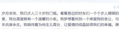 发布的内容主要分为两类:第一类是“大龄剩女愁嫁”人设——表现出对婚姻的渴望,但排斥传统相亲,希望能遇到一个能自由恋爱的对象。