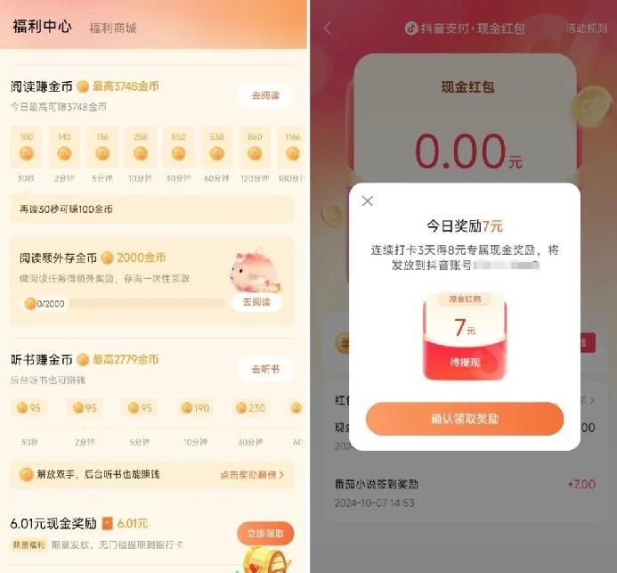 新用户阶段,番茄小说会提供不少7元、6.01元等金额的阅读红包奖励。