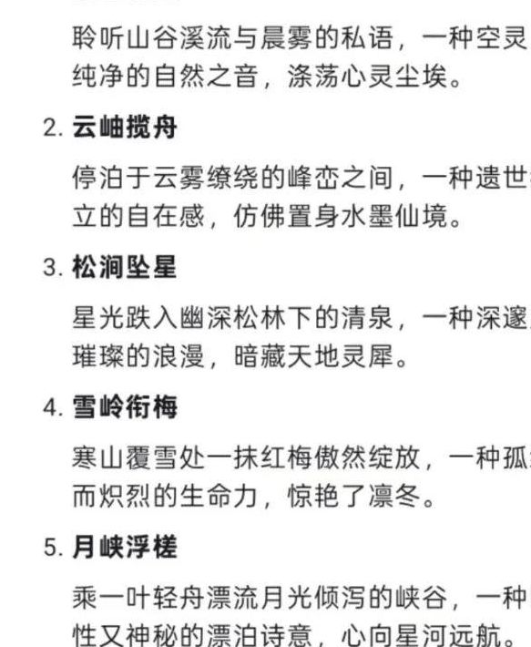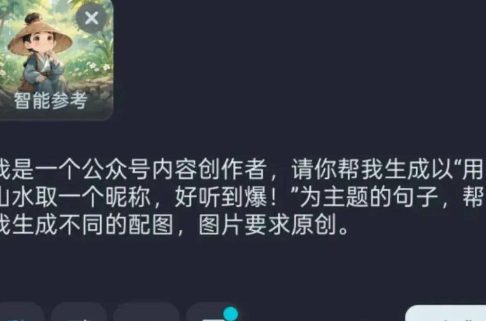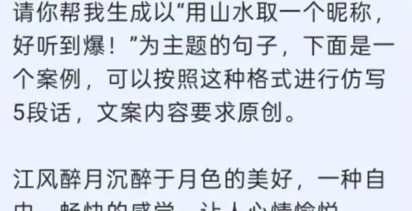 比如,想写一篇关于“山水意境昵称”的文章,只需要跟AI说:“请帮我生成20个古风山水风格的昵称,要适合当网名的那种。”你看,连一分钟都不用,一长串好听又有意境的昵称就出现在眼前了。
