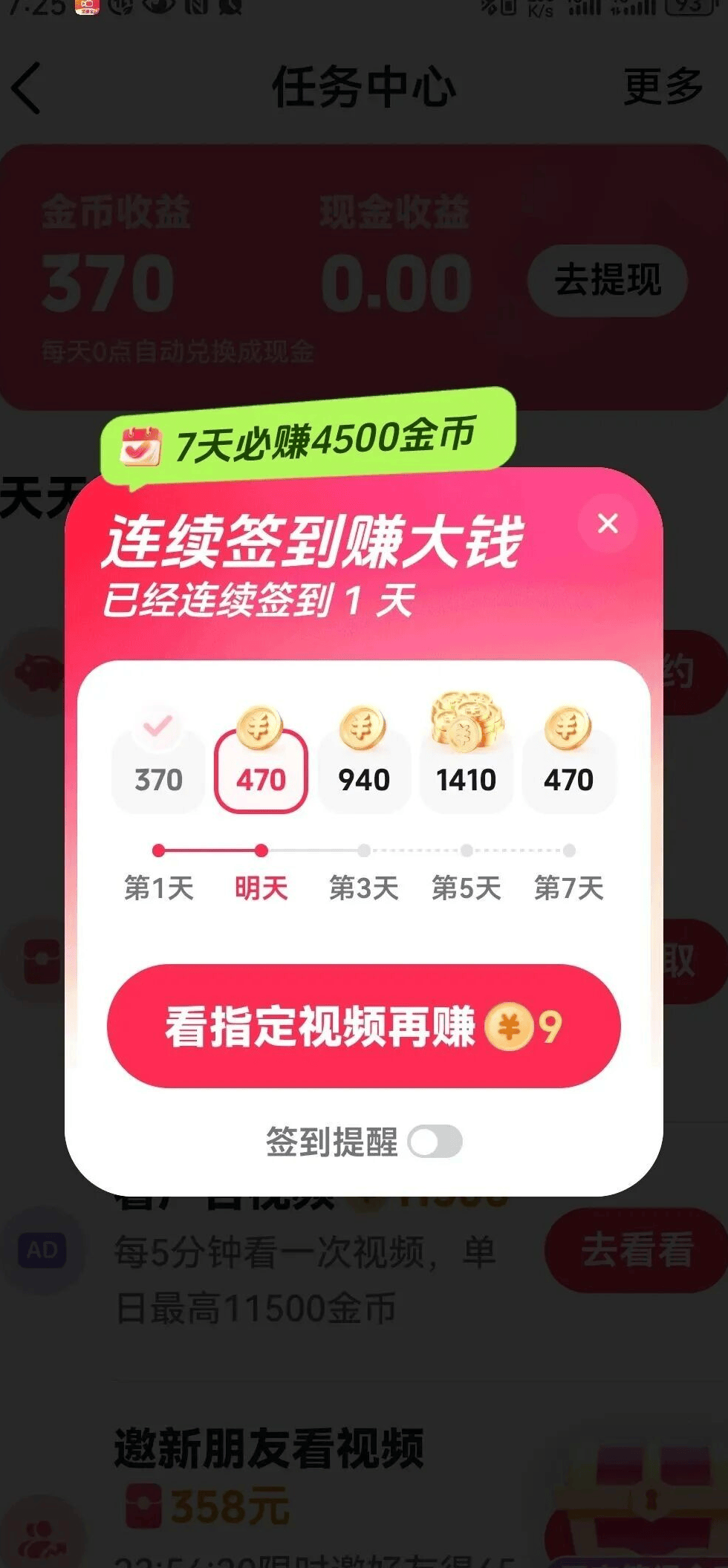 除了刷视频赚金币外,每天签到还能领取金币。这就像日常上班打卡,简单又轻松,还能有额外收获。