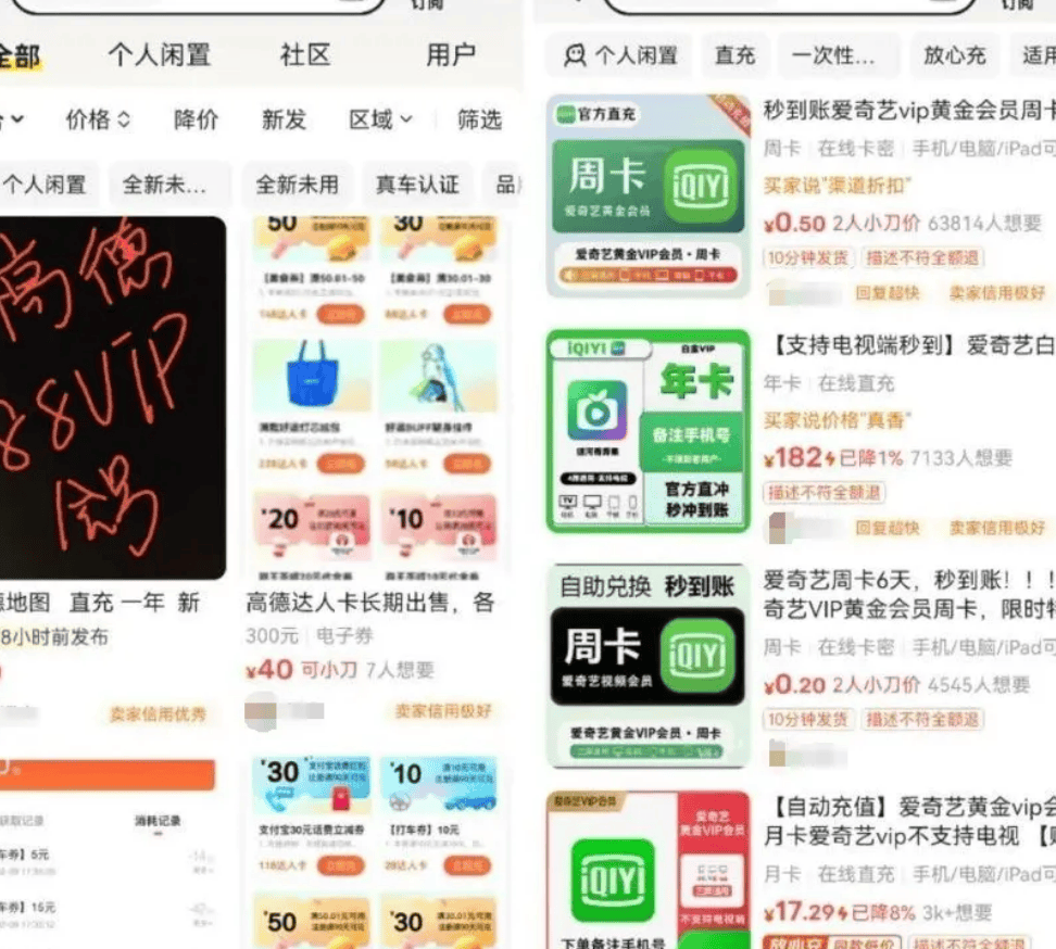 这些卡片可兑换视频会员、外卖红包,还能挂闲鱼卖掉。不少人在二手平台专门收购,变现速度很快。