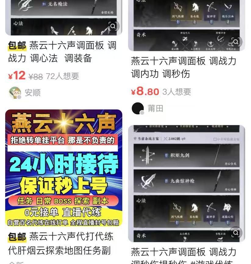 以燕云十六声为例,门派三更天的周积分排行榜已被工作室“垄断”,想上榜的话,报价为0.5积分/元,包周价格为1288元。