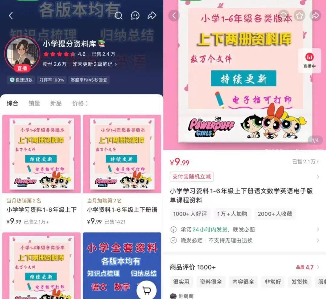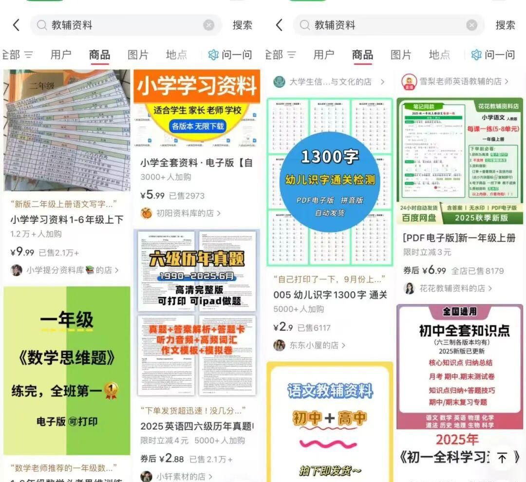 在拼夕夕、某宝上搜“小学1-6年级教辅资料”,花20-30元就能买到上千份资料,直接拆分整理就能用,特别省时间。而且这些资料里还会包含“名校内部试卷”“老师备课专用素材”等内容,家长看到这类资料,购买意愿会更高。