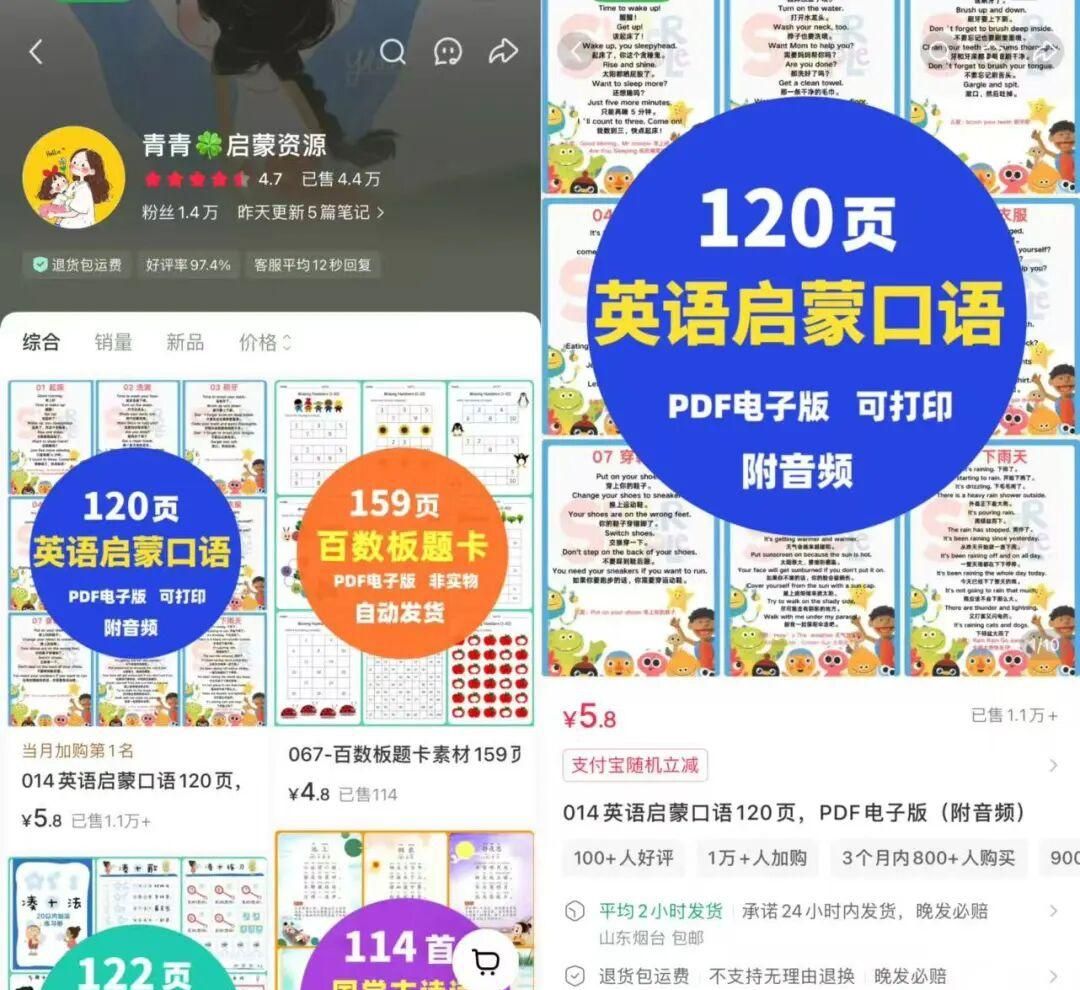 先给大家看两个实打实的真实案例:第一个账号主打小学1-6年级综合学习资料,单份仅售9.9元,累计卖出了2.4万份;另一个账号专攻英文启蒙口语资料,单价约5元,也卖出了4.4万份,收益相当可观。
