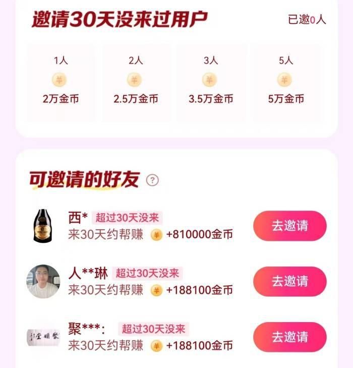 官方版本要求对方连续登录30天,奖励为135000-188100金币,折合约13-19元。虽然金额不算特别高,但好处是能帮助自己的账号提升权重,后续刷视频获得的金币也会增多。