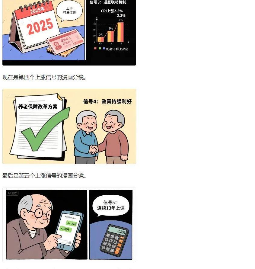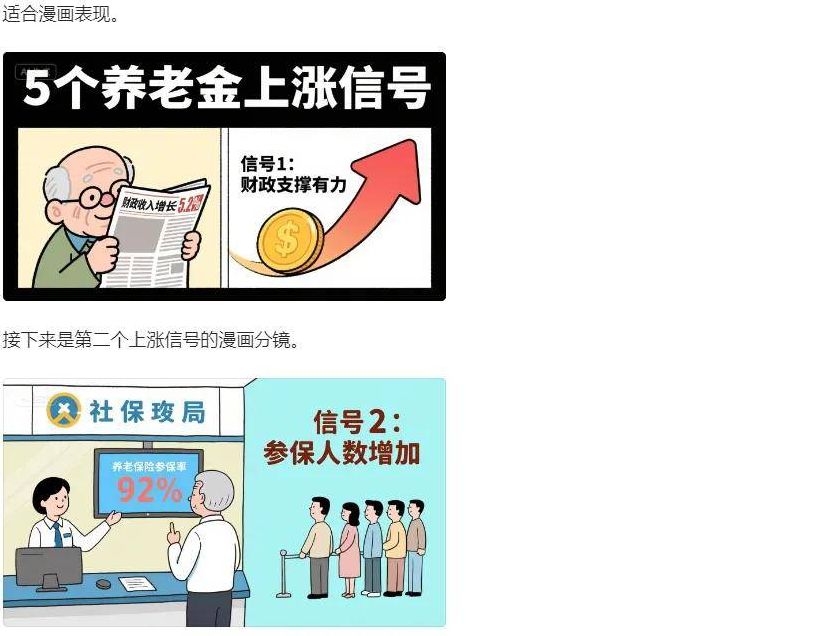 有时候实在没灵感了,我也会偷个懒,直接把我的想法告诉AI,比如跟它说“我想做一期关于养老金上涨的漫画推文”,它就能在几分钟内生成一份像模像样的图文稿,真的太神奇了。