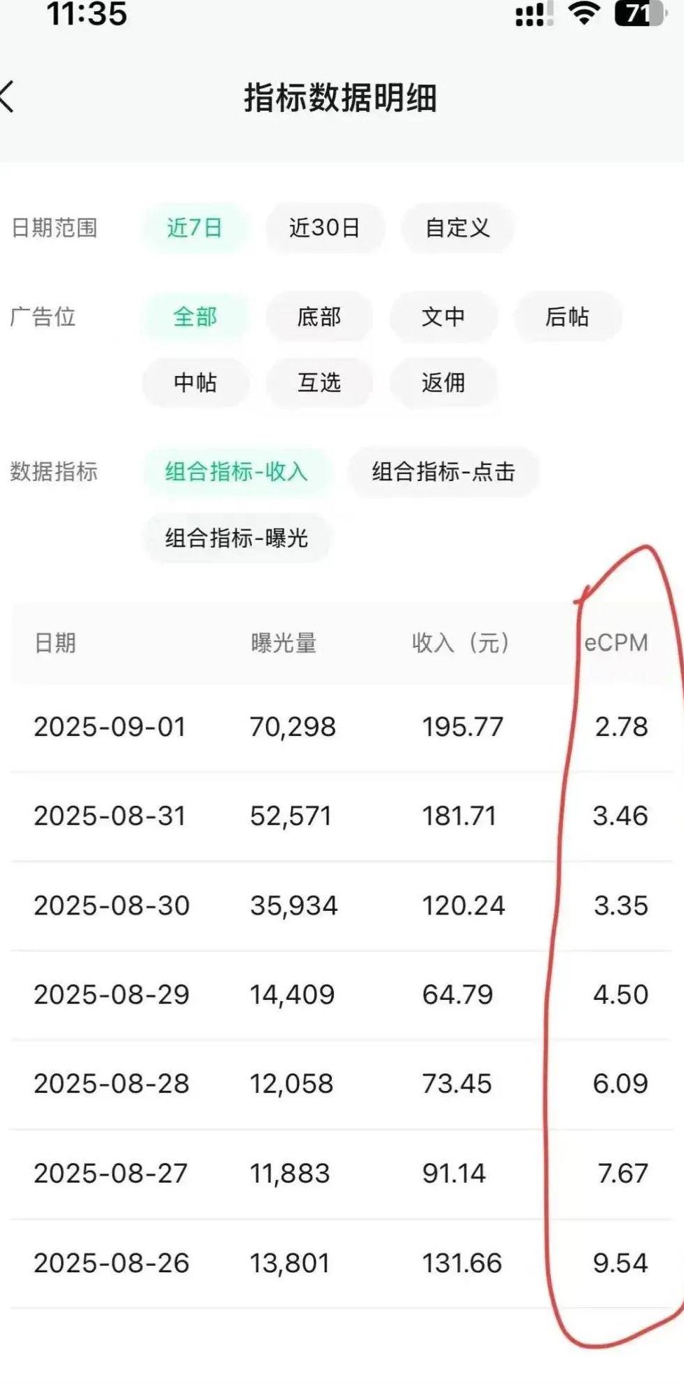 说到收入,我觉得这个项目的潜力真不小。万次阅读的收入,我见过30块的,也见过高达100块的。我琢磨着,这中间的差距主要就在于文章质量、广告展示方式和选题方向了。
