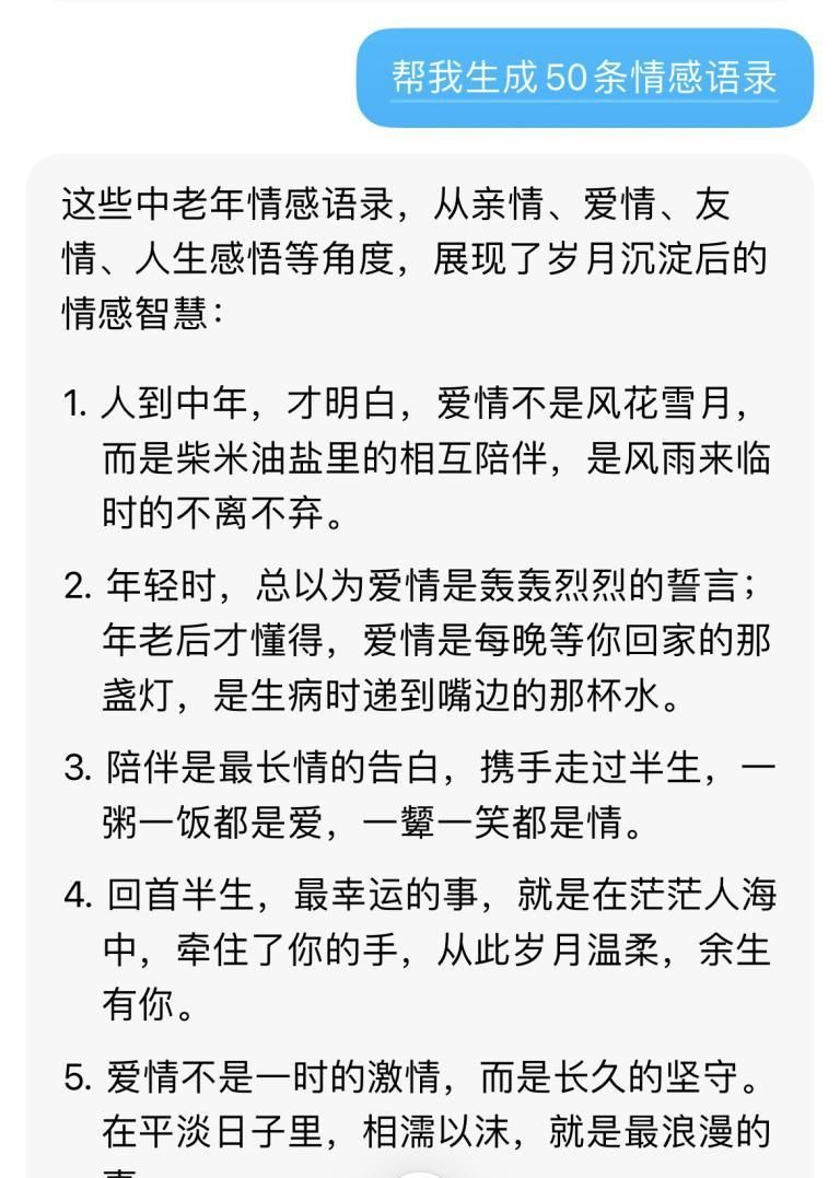 举个例子,第一步我给AI下达指令<批量生成50条情感语录>,几秒钟就能搞定↓↓