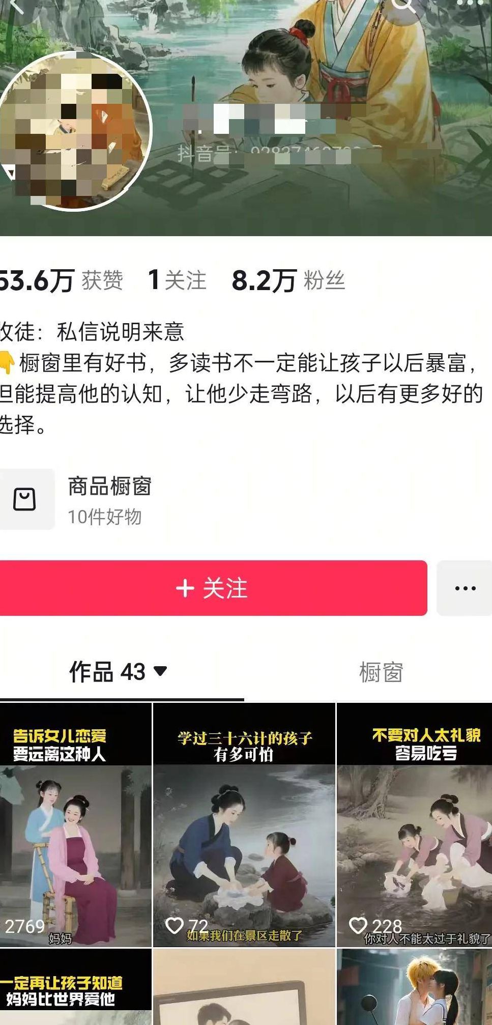 该账号通过发布43条AI生成的古风亲子对话视频,实现了8.2万粉丝的增长。这一数据清晰表明,市场对此类融合传统文化与家庭情感的内容需求旺盛,且AI生成模式的生产效率极高,能够支持内容的稳定更新,形成了可靠的运营模式。
