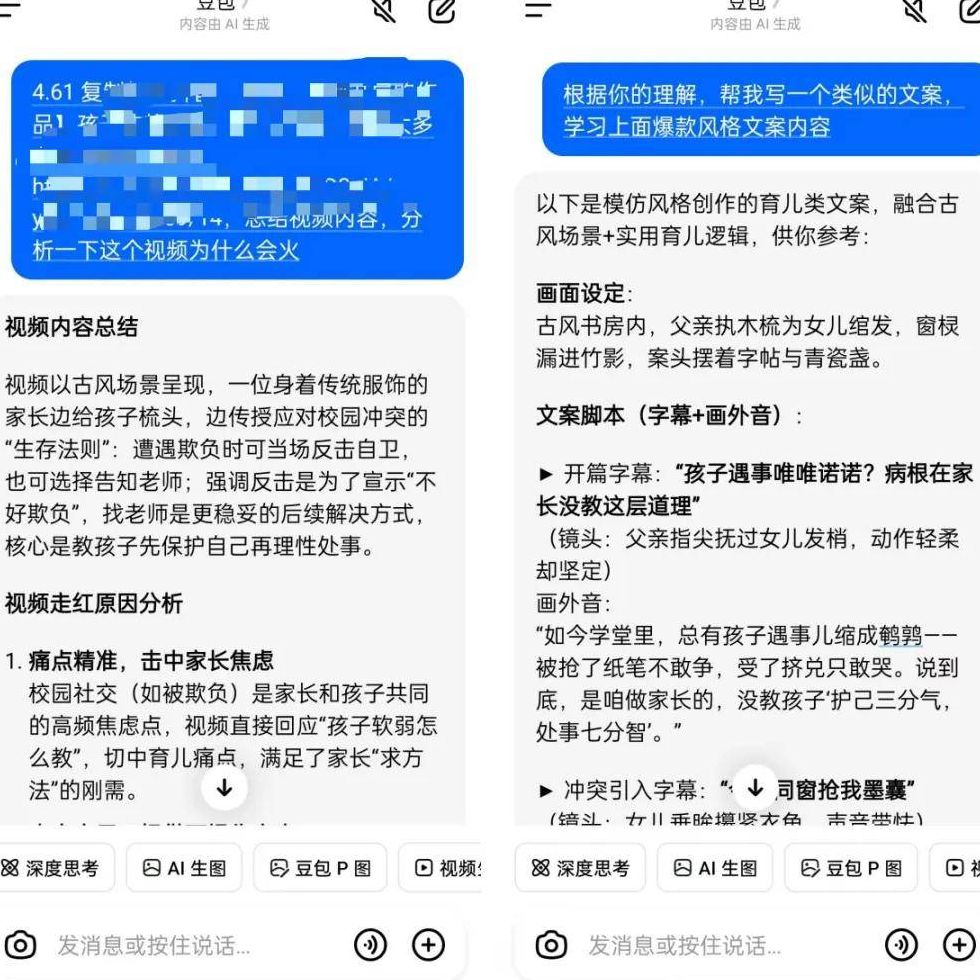 该步骤的目标是生成高质量的对话脚本与图像指令。操作一:使用豆包APP的链接分析功能,导入对标视频链接,AI会自动解析其内容结构并生成模仿性文案。这样做的目的是确保内容风格贴近市场上已验证的成功模式。
