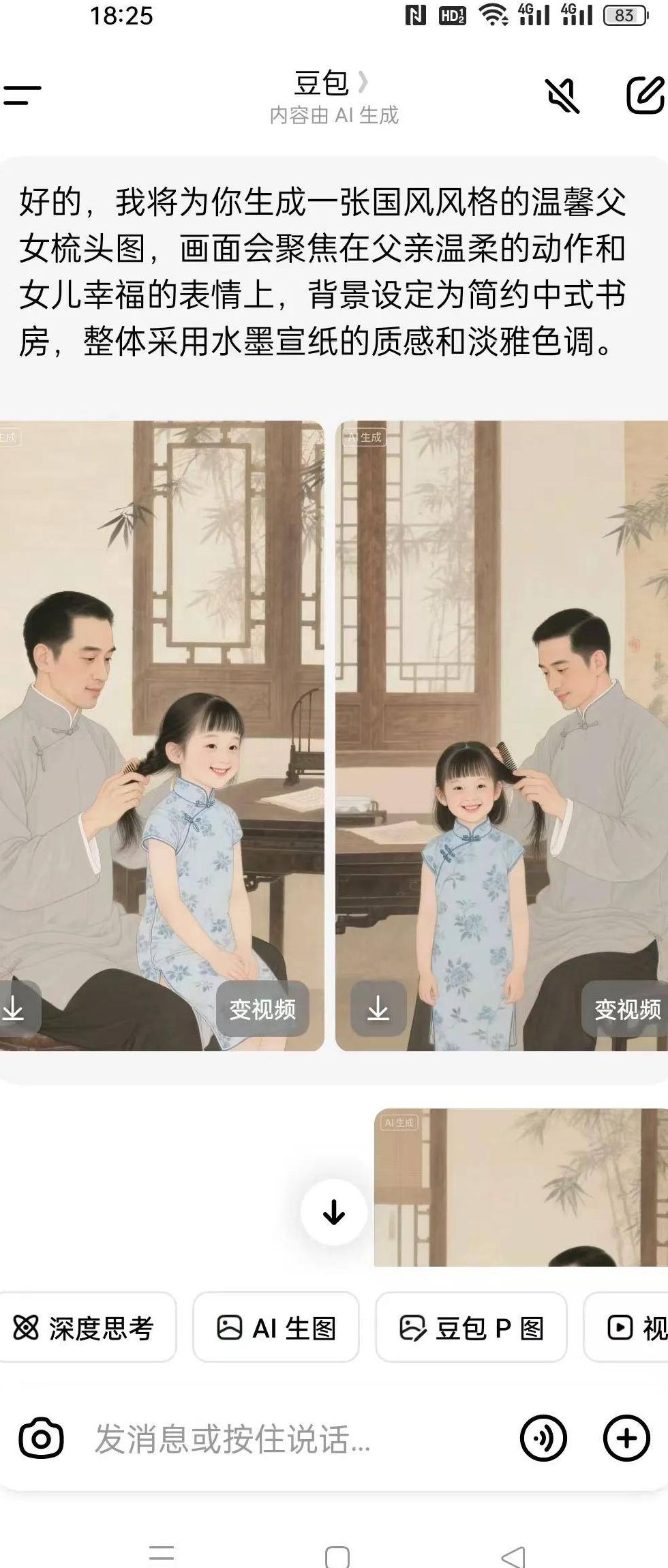 该步骤的目标是获得符合脚本意境的高质量静态图片。操作流程为:返回豆包APP,粘贴deepseek生成的长提示词,同时在模型设置中选择“国风”分类。AI会基于这一详细指令进行渲染。需从生成结果中筛选出一张构图、色彩及人物神态最符合预期的图片并下载。这是决定视频整体基调的关键环节。