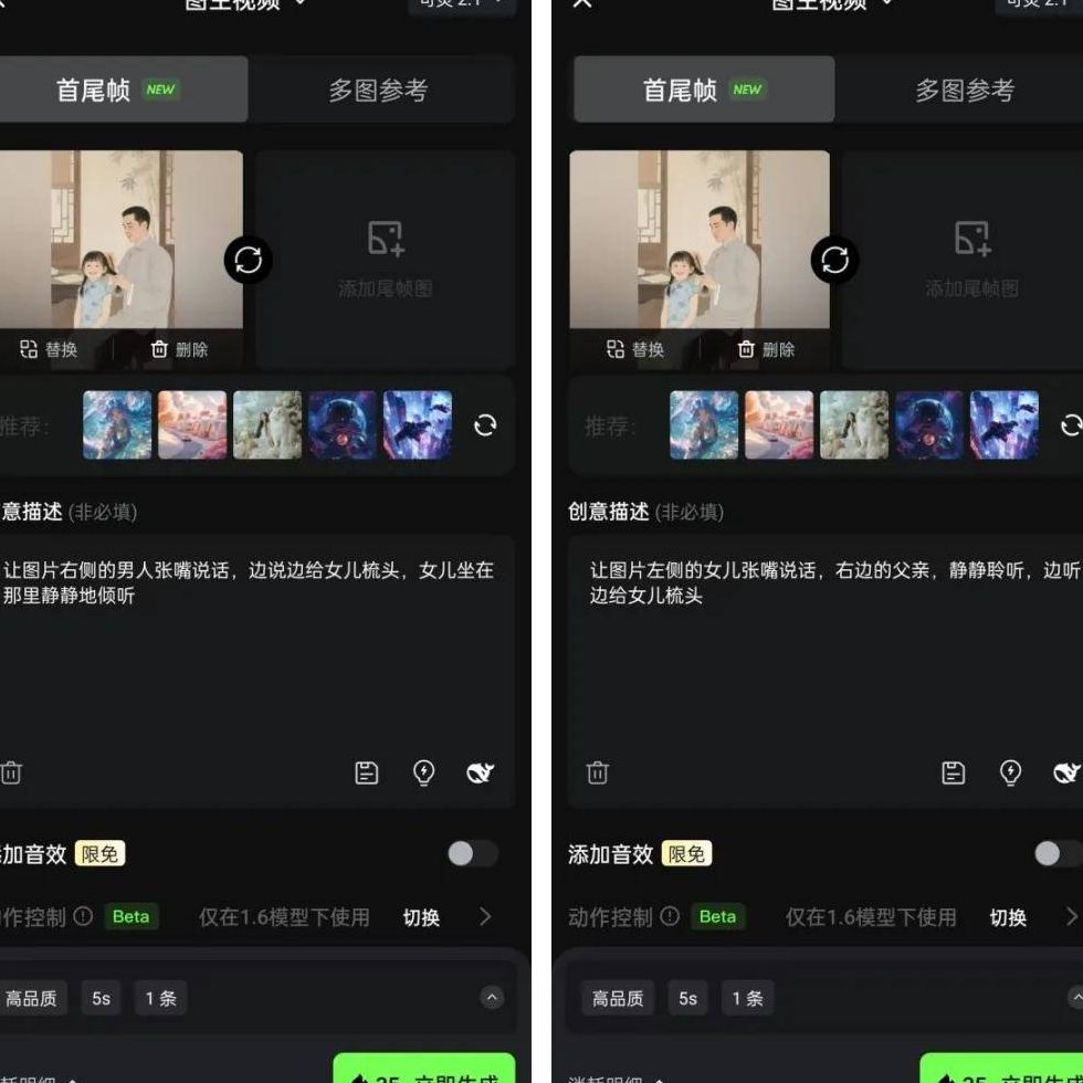 在可灵AI中,上传刚才保存的图片作为基础素材。接着,通过输入不同的动作提示词,分两次生成视频:第一次输入描述父亲说话的指令,第二次输入描述女儿说话的指令。这样做的目的是获取可交叉剪辑的素材,从而在视觉上构建流畅的对话交互感。