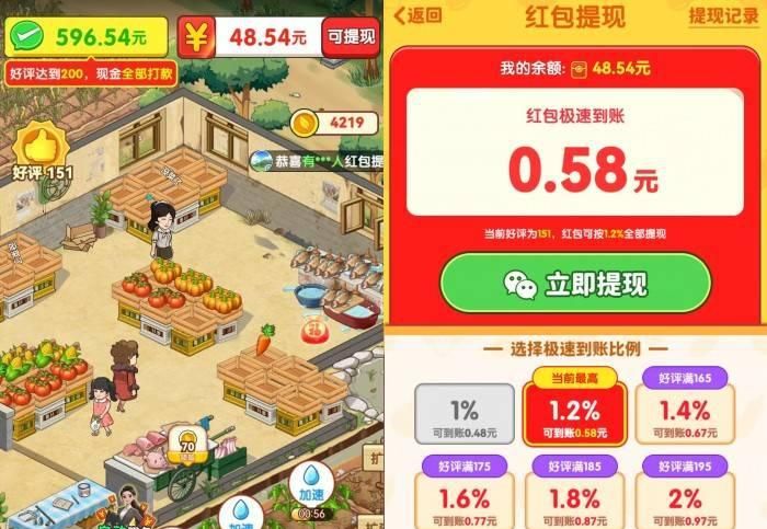 这款游戏的收益主要分为两部分:绿色区域的收益是自动打款,只要达成对应的好评数量要求,就会自动转账到你的微信账户;红色区域的收益则需要手动提现,而且并非显示多少就能提多少,实际提现时会按一定比例折算,这个比例由你的好评数量决定,界面上显示的“可到账金额”才是你真正能拿到手的钱。