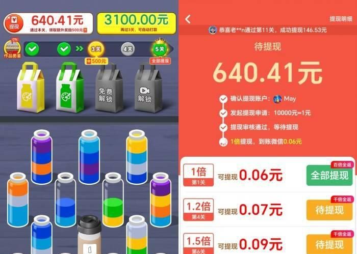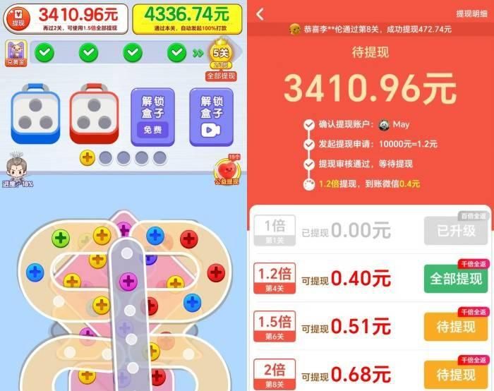 收益同样分为两部分:绿色区域的收益会在你通关时自动打款到微信;红色区域的收益需要手动提现,兑换比例是10000游戏币换1元人民币,可直接提现到微信账户。