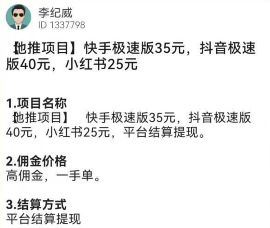 这是一个资源丰富的商务资源对接平台,提供了包括地推、APP拉新、小说推广、短剧推广在内的多种推广拉新项目。像抖音极速版、快手极速版、小红书这类常见任务,每单佣金在20-50元不等,结算快、门槛低,新人也能快速上手。