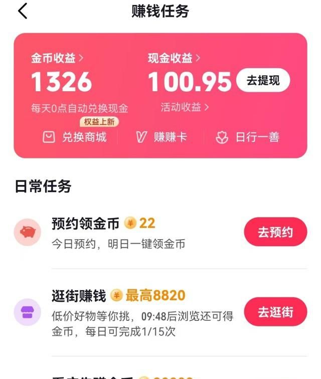 你在平台刷广告、刷视频、做日常任务就可以获得金币,这些金币都可以按照规定比例兑换成现金收益。如果账号养的好,单拿抖音极速版来说,每天就可以获得40块钱左右的收益,快手极速版也能赚十几块,如果你有多台设备和多个账号,收益还可以翻倍。
