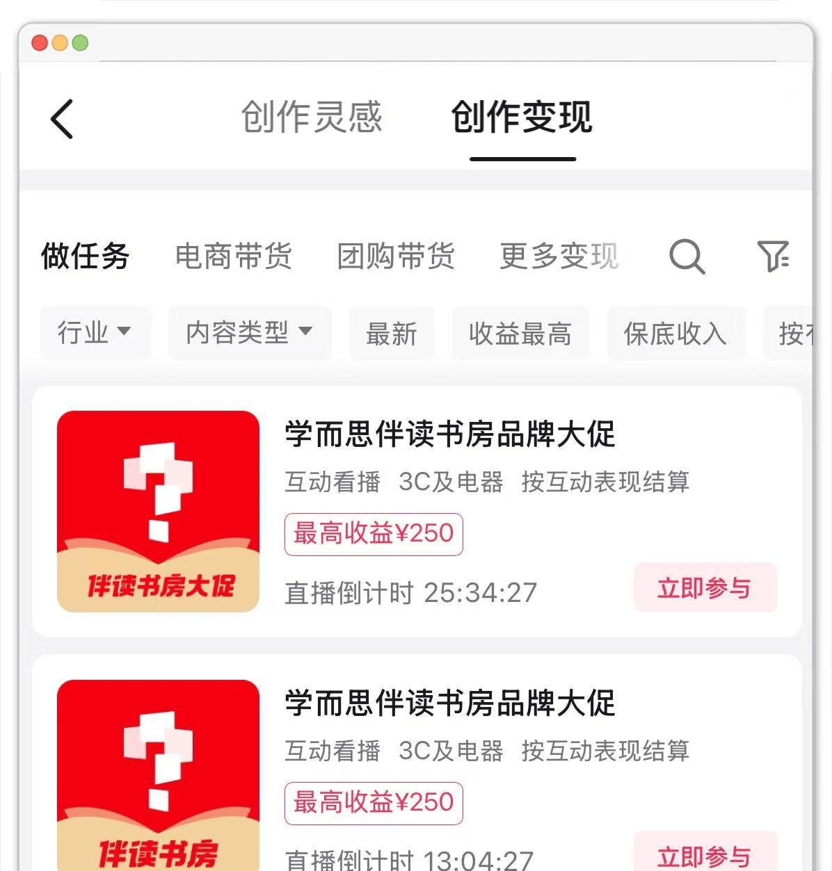 抖音互动看播,是抖音创作者中心“创作变现”栏目里的一种任务类型:按照任务要求观看指定直播,同时和主播进行互动,完成所有任务要求后,就能拿到对应的佣金奖励。