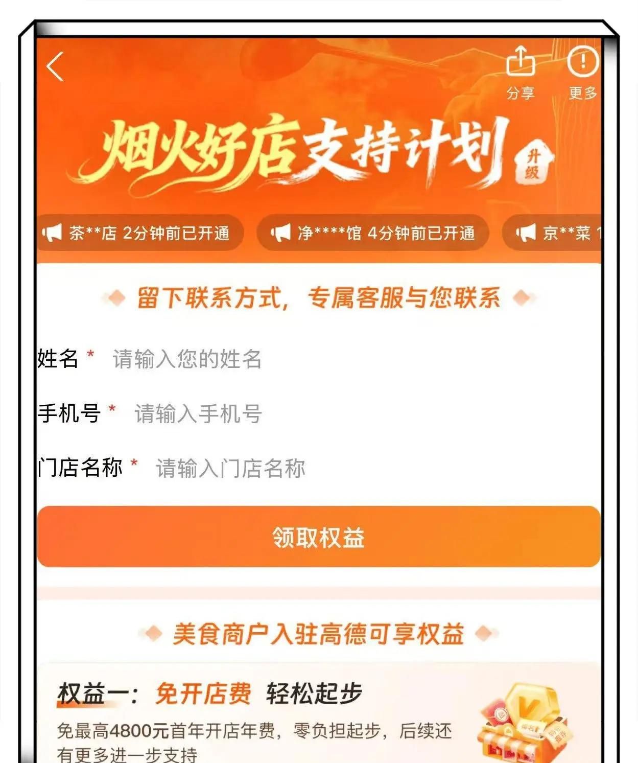 最后,进入“烟火好店支持计划”页面,按提示输入姓名、手机号、门店名称等信息,点击“领取权益”即可。
