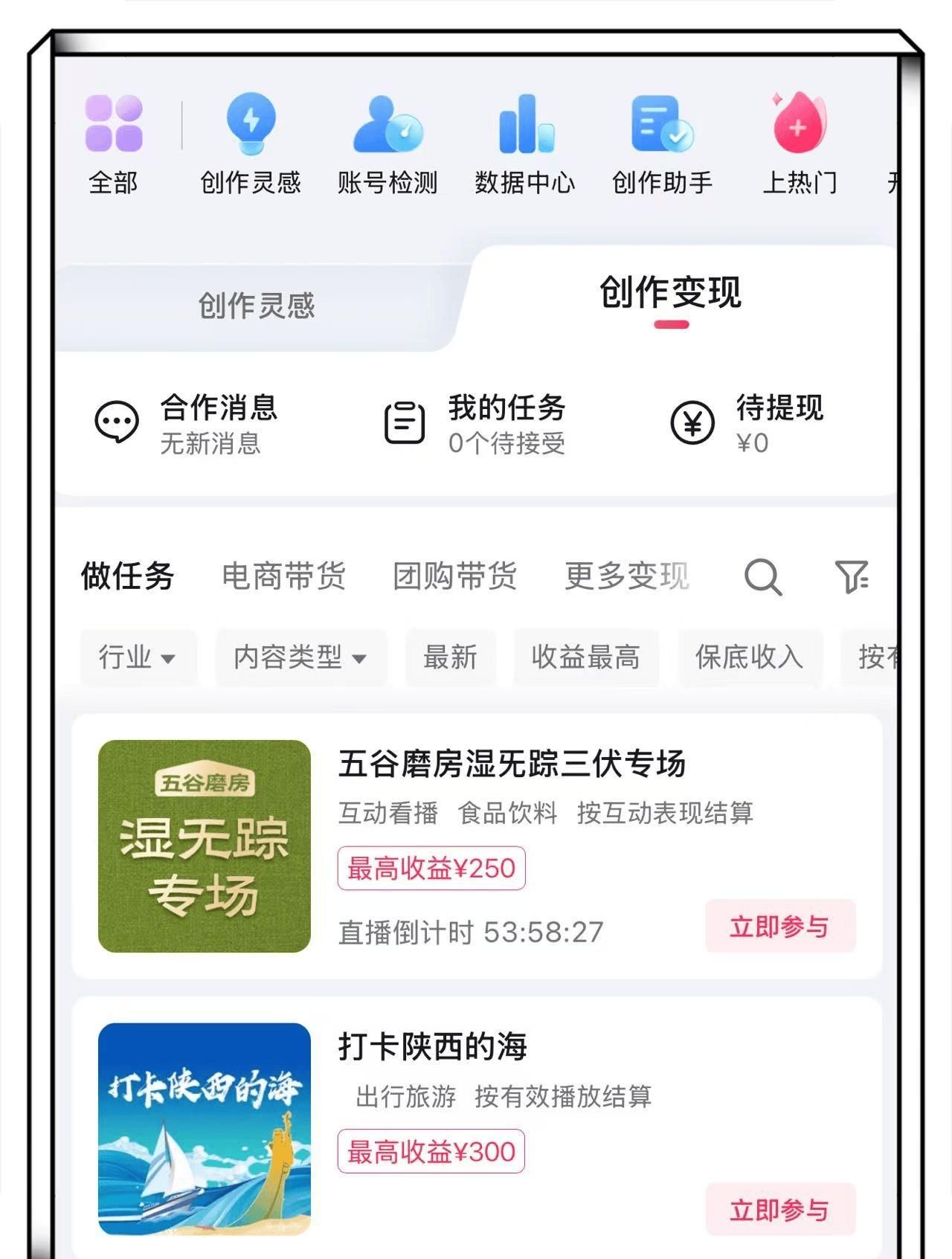 在“抖音创作者中心”的“创作变现”板块,我们可以看到数量众多的抖音任务,涵盖“视频任务”“看直播任务”“互动任务”等多种类型。