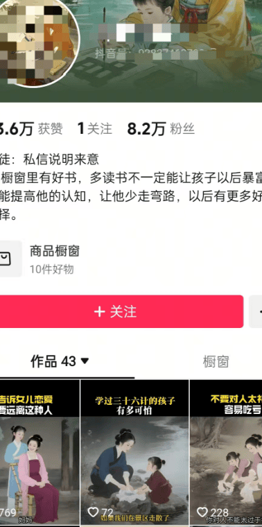 我关注的一个对标账号,仅仅只发了43条作品,粉丝量就冲到了8.2万,这个数据放在新号里相当亮眼。我拆解了他所有作品后发现,内容都是AI生成的古风亲子对话,形式新颖还特别能引发家长群体的情感共鸣,而且制作流程一点都不复杂,就算是零基础新手也能轻松上手。今天就把这个抖音AI亲子对话视频的完整玩法,给大家彻彻底底拆解明白。