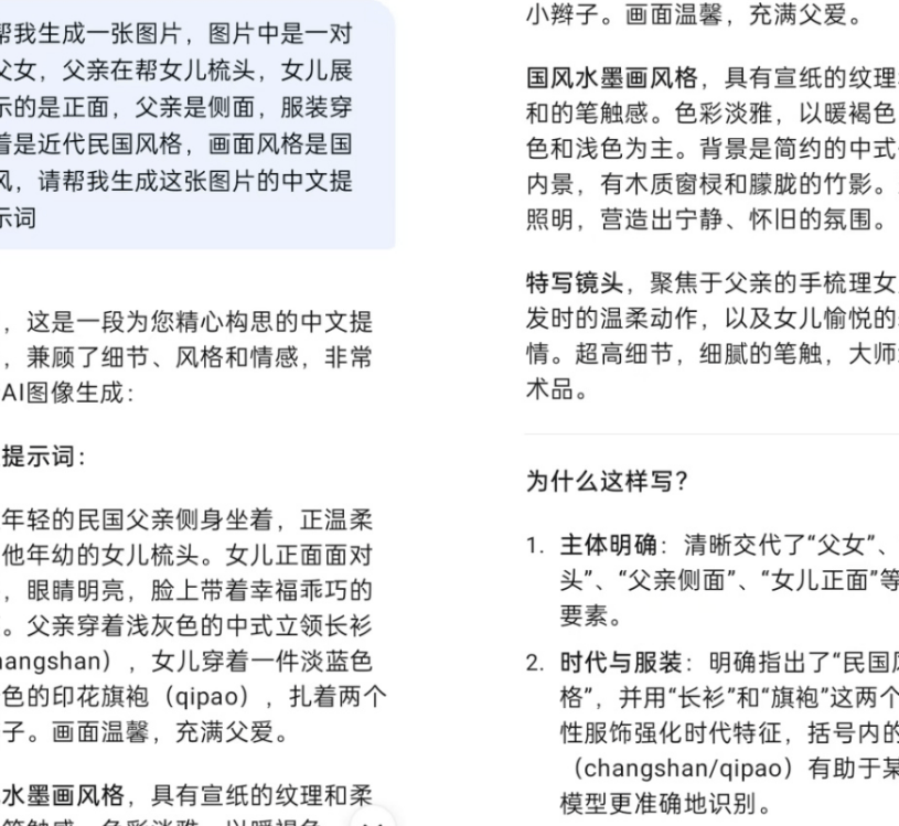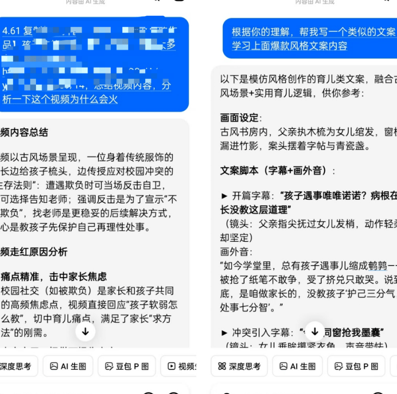 接下来给大家讲项目的具体操作流程:整个制作只需要用到几个现成工具,每一步都简单易懂,我拆成四个关键步骤,看完就能上手。第一步是准备文案和作图提示词:文案是视频的灵魂,我们打开豆包APP,把对标账号的爆款视频链接发给它,让AI先分析内容风格,再生成原创文案;不过豆包生成的图片提示词往往不够精准,我们可以打开DeepSeek,只需要简单描述画面需求(比如 “古风父亲和女儿在书房对话”),它就能生成更详细专业的绘图提示词。