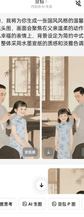 第二步是生成背景图片:拿到提示词后,我们回到豆包APP的AI生图功能,复制DeepSeek生成的提示词,风格选择国风,点击生成后挑选一张满意的图片就可以,完全不需要自己设计画面。