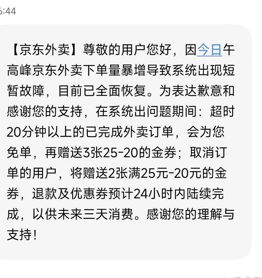 刘强东送外卖的热度刚过,次日下午京东便发布道歉声明:因系统出现故障,导致平台出现20分钟短暂异常,文末还提到将额外发放10万张优惠券