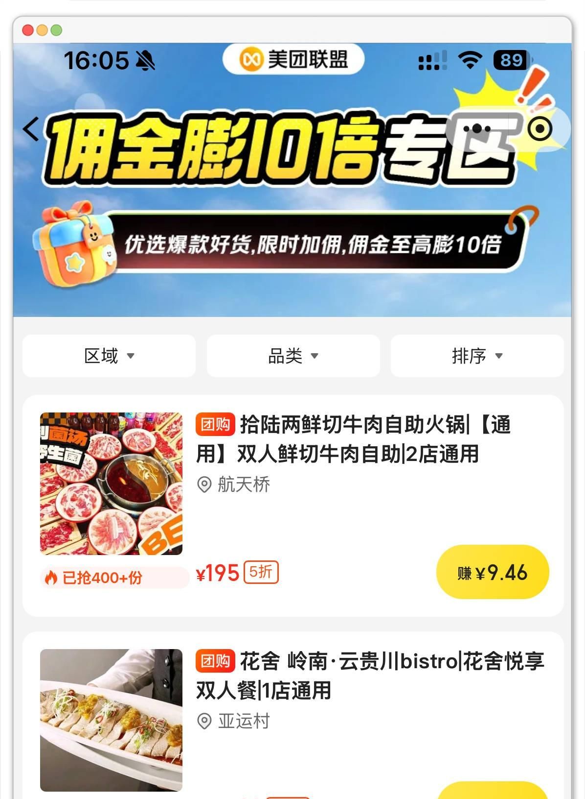 在美团联盟“佣金膨胀10倍”的活动里,基本都是高佣金的团购链接,既能分享赚钱,也能自用省钱。