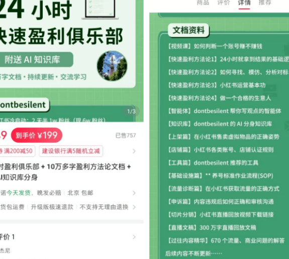 第一个是刚上线的店铺,知识库单价199元,显示已售757单。199元×757单,光这一个链接就赚了近15万元!要知道电子文档本身没有成本,利润基本是纯赚的,而且不用囤货、不用发货,操作起来格外省心。