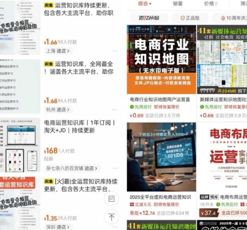 - 资料来源:找资料其实很简单,在某鱼或某多多搜索相关关键词,比如“电商运营资料”“小红书运营合集”,就能找到大量资源,花费不多,甚至能找到低价打包的,无需自己从零开始整理。