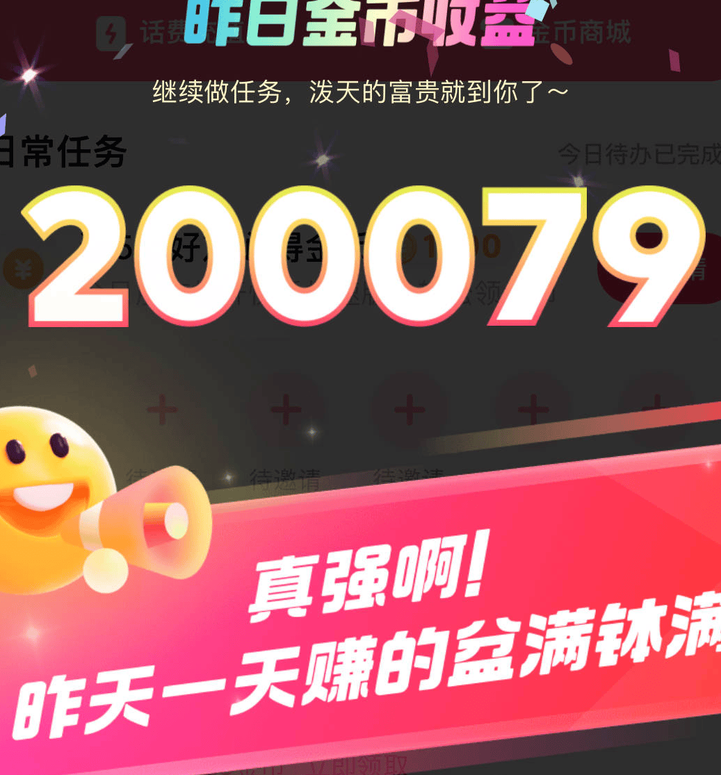 虽然有些人觉得它的兑换比例低——33000金币才等于1元,但这反而成了它的优势。因为竞争小,任务多。我曾花了两个小时,就刷到20万金币,差不多能兑换6元。