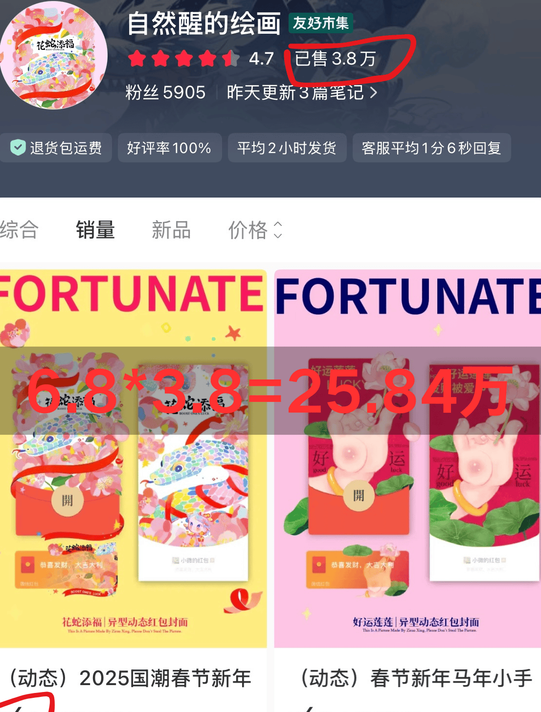 你敢信?一个只有3000多粉丝的小账号,就靠简单设计并上架的一款红包封面,单款就卖了2.4万份,整个账号靠这一个品就变现20万。点进他的账号店铺就能看到,客单价基本定在6.8元,学生党也能轻松消费,客户群体特别庞大。