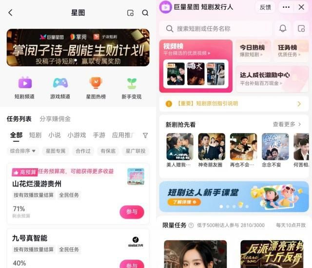 和抖音的巨量星图相对应,快手也有一个专门的达人接单平台——磁力聚星,里面也提供了大量的短剧推广任务,佣金比例比较高。