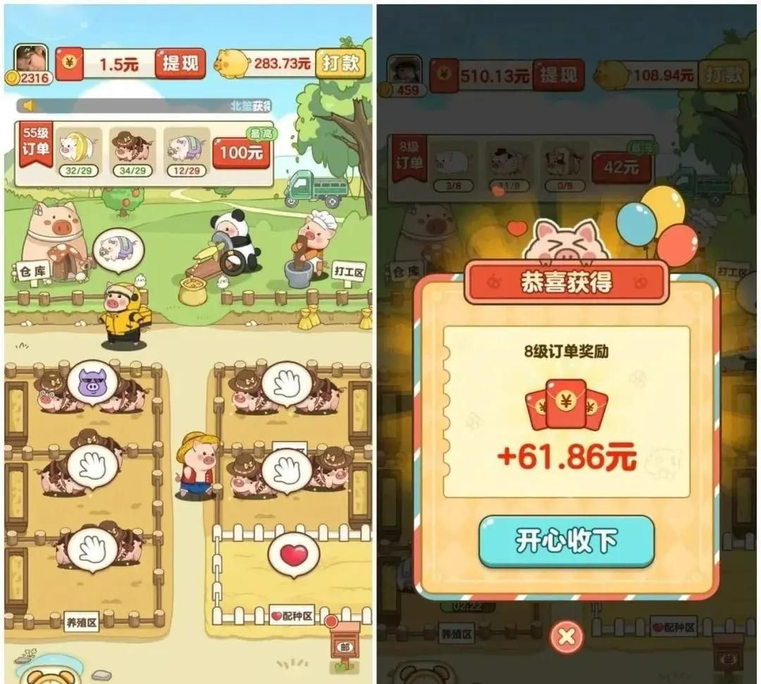 全民养猪场的核心赚钱方式是喂养小猪,待小猪长大后出售可获得金币;完成出售订单后即可领取红包收益,不同等级的订单收益比例在0.21%-95.3%之间。
