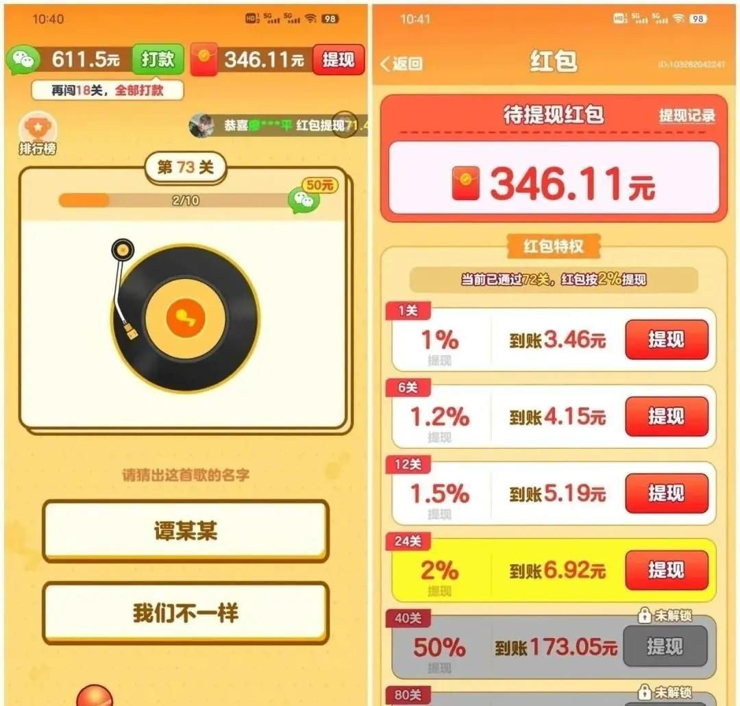 初期每猜对一首歌曲可获得0.1至0.15元不等的奖励,后续需连续闯过20关并满足签到5天等条件,才能解锁更高收益。
