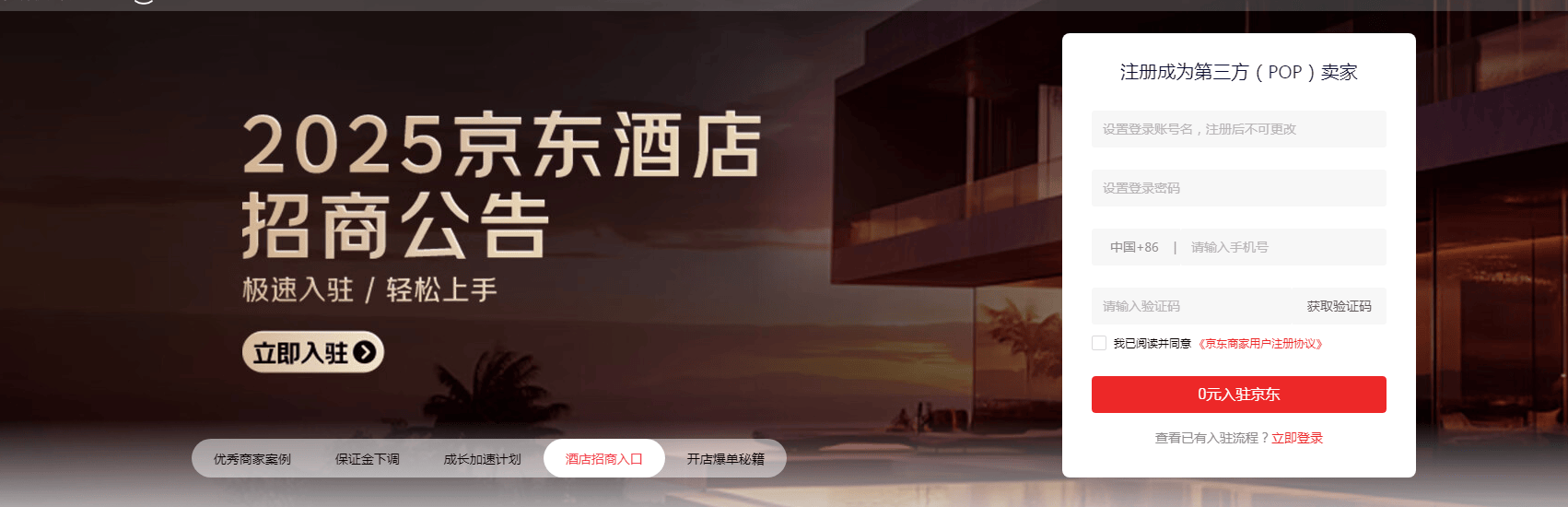 通过浏览器搜索「京东酒店」进入京东官网后,点击右上角的【客户服务】,再选择【合作招商】,翻到第四张滑动页面就能找到酒店招商入口,商家填写信息、提交资质材料,审核通过后即可成功入驻。