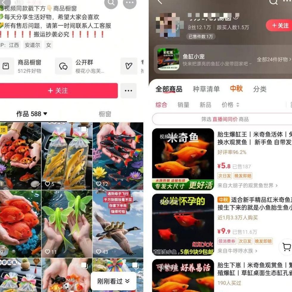 你看,这个账号专门售卖各类高颜值观赏鱼,所有视频内容全是AI生成的。可别小瞧它,目前已经有1.5万人下单,实际销量说不定还不止这个数呢!