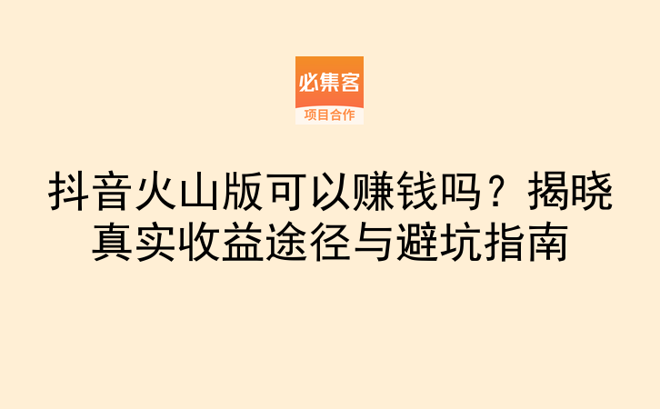 有问题在评论区留言,我会尽量回复。觉得有用的话赶紧收藏,免得以后找不到了。其实除了抖音火山版,抖音、快手、视频号这些平台都有类似的赚钱机会,关键是找到适合自己的方法并坚持下去。必集客是项目资源对接平台,提供副业项目和合作资源,适合找合作、拓业务的朋友,如果你想了解更多平台的变现方式,可以去看看有没有适合自己的资源。快去试试吧,说不定下一个通过短视频赚钱的就是你。
