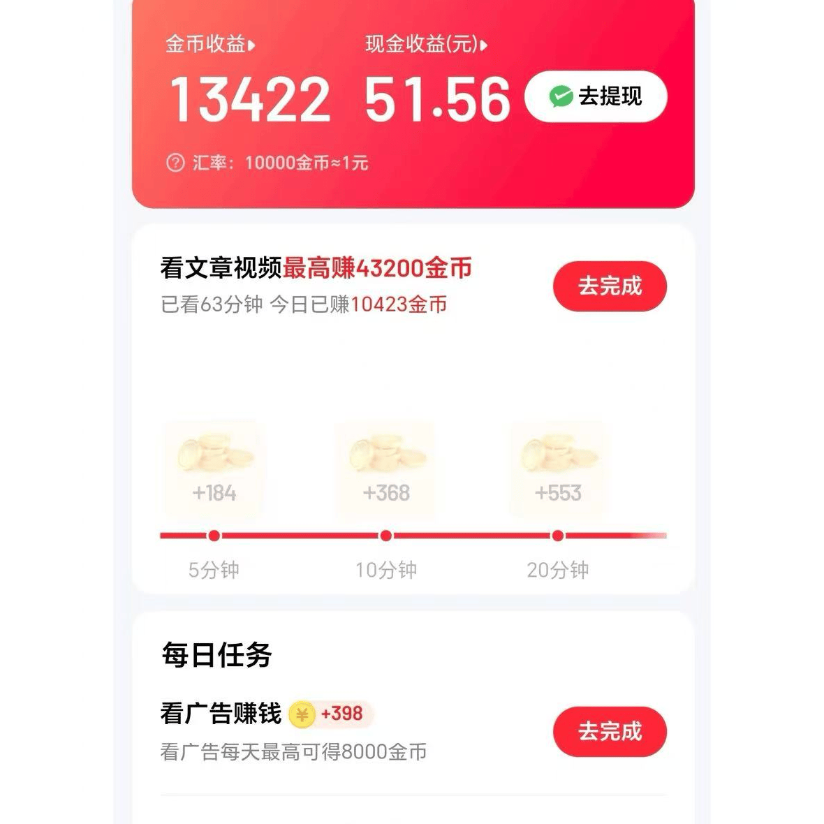 做任务赚金币的逻辑其实很简单:完成平台指定的任务,比如签到、观看广告、刷短视频、开宝箱等,就能赚取金币。根据账号权重和做任务的技巧差异,单个账号每天能赚15万-30万金币不等。金币按10000:1的比例兑换成现金,换算下来单个账号一天的收入大概在15-30元之间。