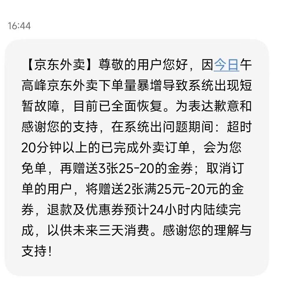 刘强东送外卖的热度还没完全褪去,第二天下午京东就发布了一则道歉声明:称因系统故障,平台出现了20分钟的短暂异常,声明末尾还表示会额外发放10万张优惠券。