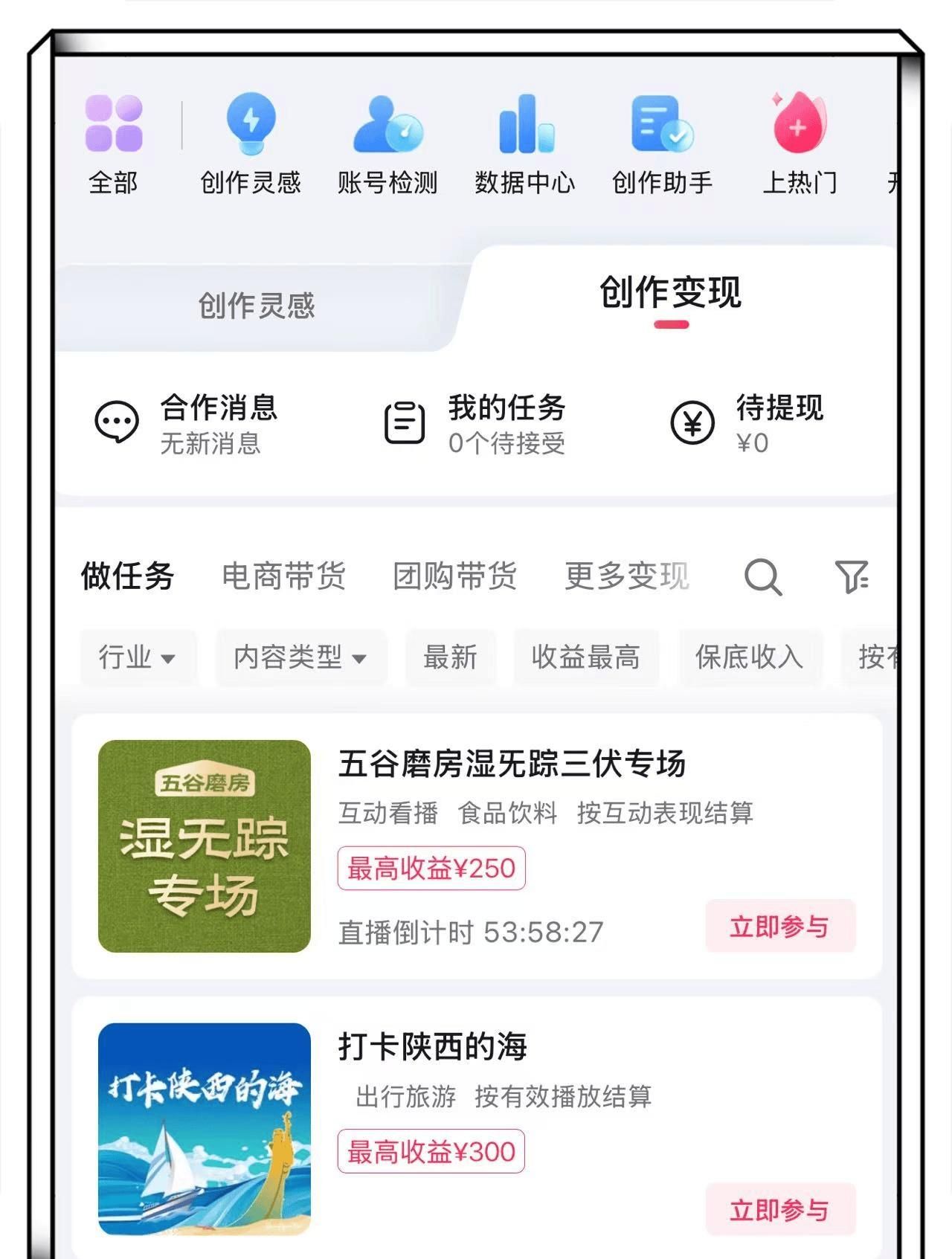 很多人可能没听过抖音发视频还能赚钱,其实这个入口就在抖音创作者中心的“创作变现”板块里,里面有各种类型的视频任务,按要求完成后就能获得相应的佣金收益。